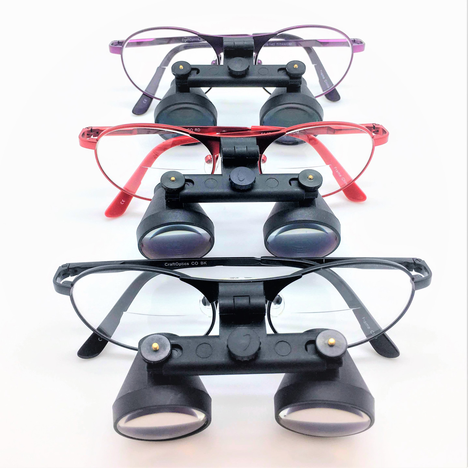 - Patented, high resolution binocular magnifying telescopes are attached to the CraftOptics frame, and flip up when not needed. Adjustable magnifier hinge for a comfortable viewing angle.
